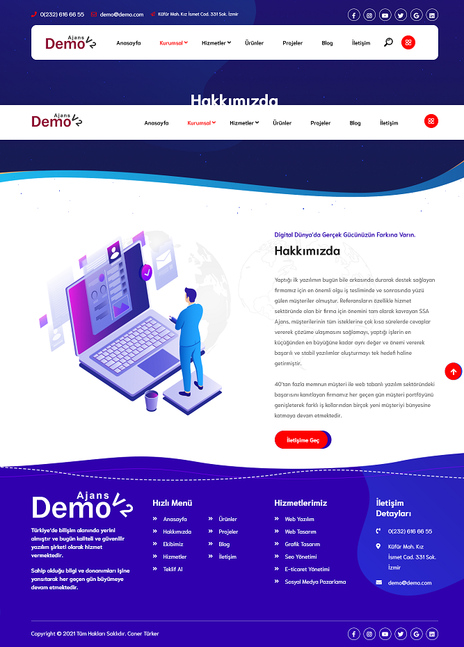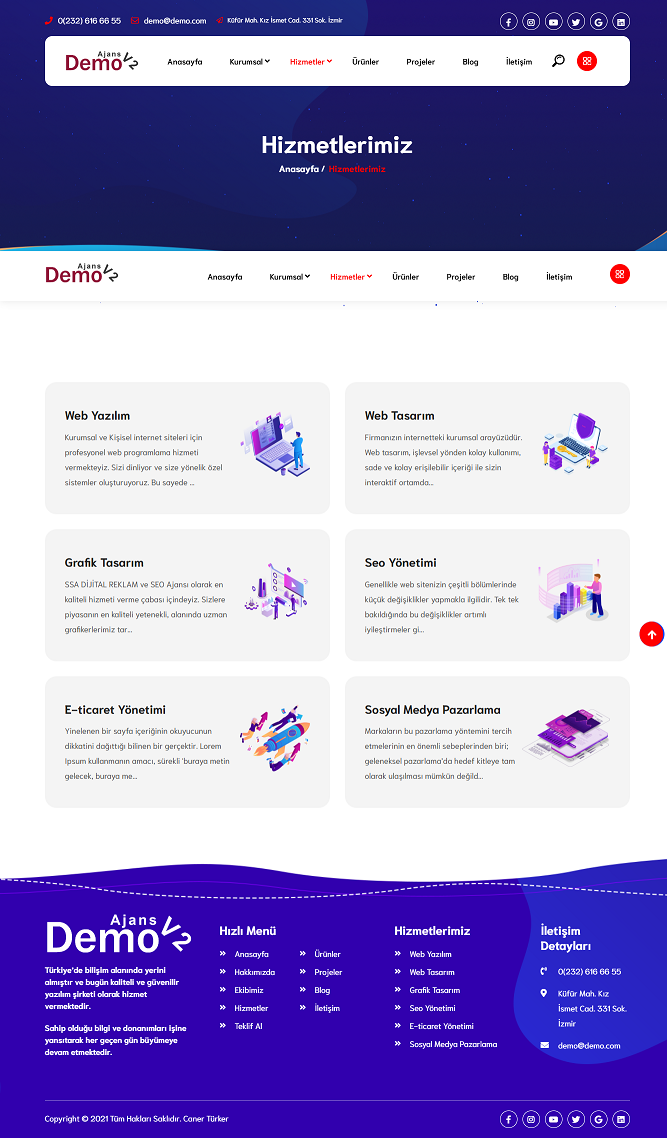 Hizmetlerimiz bölümünde; Web Yazılım, Web Tasarım, Grafik Tasarım, SEO Yönetimi, E-ticaret Yönetimi, Sosyal Medya Pazarlama gibi hizmetleri ayrıntılı olarak tanıtma imkanı