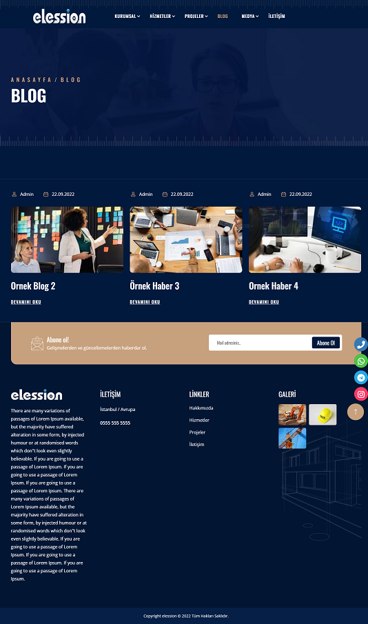 • Ana sayfada öne çıkan projeler, hizmet blokları ve iletişim çağrıları